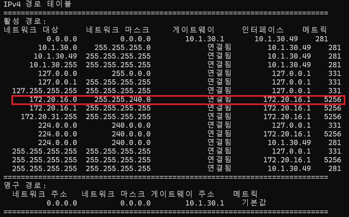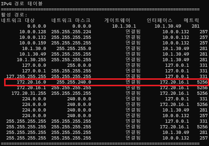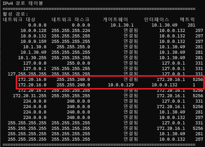 As shown in Figure 6, routing is applied because the network used by WSL overlaps with the AWS VPC network range. Based on the metric value, client requests destined for 172.20.16.0/20 are prioritized to go through the AWS VPC.