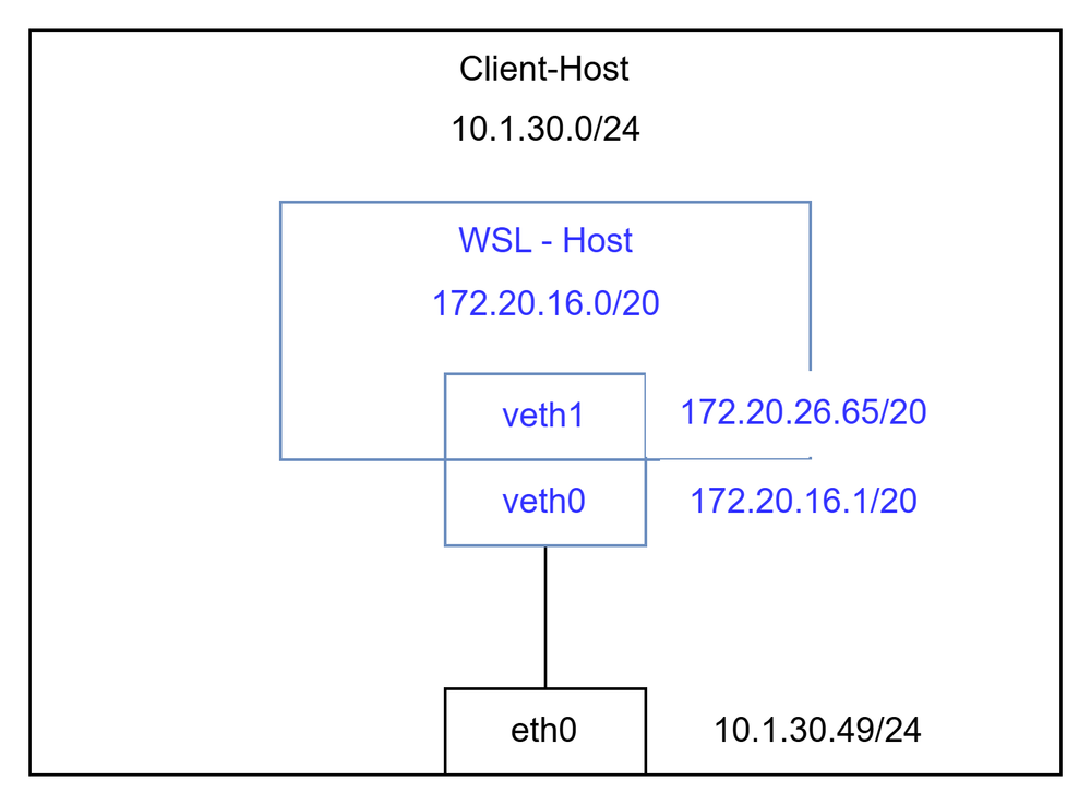 Consequently, communication from the Windows host to the WSL host at 172.20.26.65 occurs via veth0, and the routing table is configured to forward traffic for the 172.20.16.0/20 CIDR to veth0.